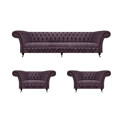 Das Chesterfield Design Luxus Polster Sofa Couch Sitz Garnitur aus Polster Stoff Textil bietet eine stilvolle und komfortable Ergänzung für Ihr Wohnzimmer. Diese Garnitur besteht aus einem 3-Sitzer-Sofa und zwei Sesseln.