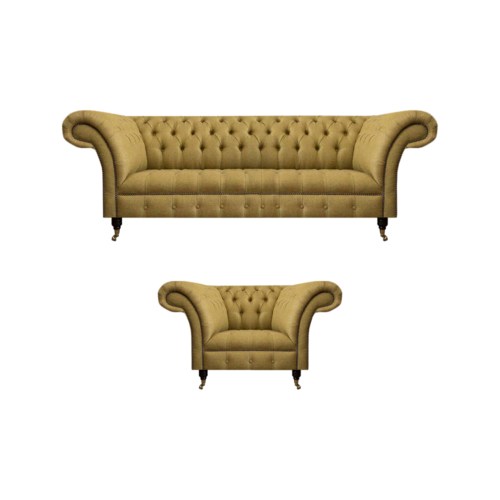 Diese elegante Chesterfield-Sofagarnitur verleiht Ihrem Wohnzimmer einen Hauch von Luxus und Komfort. Das 3-Sitzer Sofa bietet großzügige Abmessungen von ca. 220 x 90 x 80 cm (Länge x Breite x Höhe), mit einer bequemen Sitzhöhe von ca. 42 cm und einer Sitztiefe von ca. 52 cm. Der passende Sessel ergänzt das Ensemble mit Maßen von ca. 130 x 90 x 80 cm.
