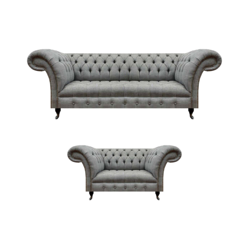 Diese luxuriöse Chesterfield-Sofagarnitur in Grau bietet eine elegante und komfortable Lösung für Ihr Wohnzimmer. Das Set besteht aus einem Dreisitzer und einem Zweisitzer, die durch ihre hochwertigen Materialien und das klassische Design bestechen.