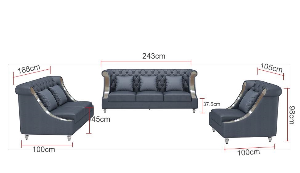 Erwecken Sie Ihr Wohnzimmer zum Leben mit unserer Design Wohnlandschaft Sofagarnitur! Diese exklusive 3+2 Sitzer Ledersofa im Chesterfield Stil wird garantiert zum Highlight in Ihrem Zuhause. Unsere große Auswahl an Farben, darunter Braun, Grün, Schwarz, Blau, Rot und Grau, gibt Ihnen die Freiheit, das Sofa nach Ihren Wünschen anzupassen. Zudem können Sie aus verschiedenen hochwertigen Materialien wie Samt, Velours, Polyester, Kunstleder oder echtem Leder wählen. Die Maße der Sofagarnitur sind: - 2 Sitzer: ca. 168 x 100 x 98 cm - 3 Sitzer: ca. 243 x 100 x 98 cm Die bequeme Höhe von ca. 98 cm und die großzügige Sitztiefe von ca. 65 cm sorgen für maximalen Komfort beim Entspannen. Optional stehen Ihnen verschiedene Materialgruppen zur Auswahl, darunter Premium Lederfaserstoff, Premium Echtleder, Premium Textilstoff und Premium Vollleder. Sie haben die Freiheit, das Sofa nach Ihren Vorlieben zu gestalten. Hergestellt aus hochwertigen Materialien wie Premium Lederfaserstoff (70% Leder / 30% Polyester) und echtem Holzgestell, wird dieses Ledersofa Ihre Erwartungen übertreffen. Erwecken Sie Ihr Wohnzimmer zum Leben und genießen Sie luxuriösen Komfort mit unserer Design Wohnlandschaft Sofagarnitur!