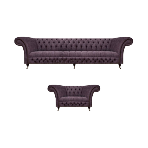 Diese exklusive Garnitur aus einem Design Dreisitzer Sofa und einem luxuriösen Sessel im Chesterfield-Stil verleiht Ihrem Wohnzimmer eine edle Note. Das 3-Sitzer Sofa bietet großzügige Abmessungen von ca. 220 x 90 x 80 cm (Länge x Breite x Höhe) mit einer komfortablen Sitzhöhe von ca. 42 cm und einer Sitztiefe von ca. 52 cm. Der dazu passende Sessel misst ca. 130 x 90 x 80 cm.