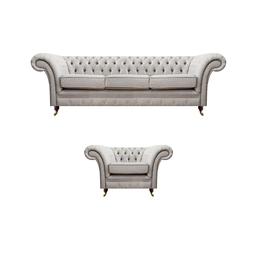 Entdecken Sie unser Grau Luxus Set bestehend aus einem dreisitzigen Chesterfield-Sofa und einem passenden Sessel für Ihr Wohnzimmer! Mit Maßen von ca. 220 x 90 x 80 cm beim Sofa und ca. 130 x 90 x 80 cm beim Sessel bietet dieses Set Komfort und Eleganz zugleich. Die Sitzhöhe beträgt ca. 42 cm und die Sitztiefe ca. 52 cm, ideal zum Entspannen. Wählen Sie aus einer Vielzahl von Farben wie Braun, Grün, Schwarz, Blau, Rot und natürlich Grau sowie verschiedenen Materialien wie Samt, Velours, Polyester, Kunstleder oder Leder. Personalisieren Sie Ihr Sofa mit Optionen wie einer Bettfunktion mit Matratze oder edlen Kristallsteinen. Das Innengestell aus echtem Holz und die hochwertige Verarbeitung garantieren Langlebigkeit und Komfort. Ergänzen Sie Ihr Wohnzimmer mit diesem luxuriösen Set und schaffen Sie eine stilvolle Atmosphäre. Gönnen Sie sich diesen exklusiven Wohntraum nach Ihren Wünschen gestaltet!