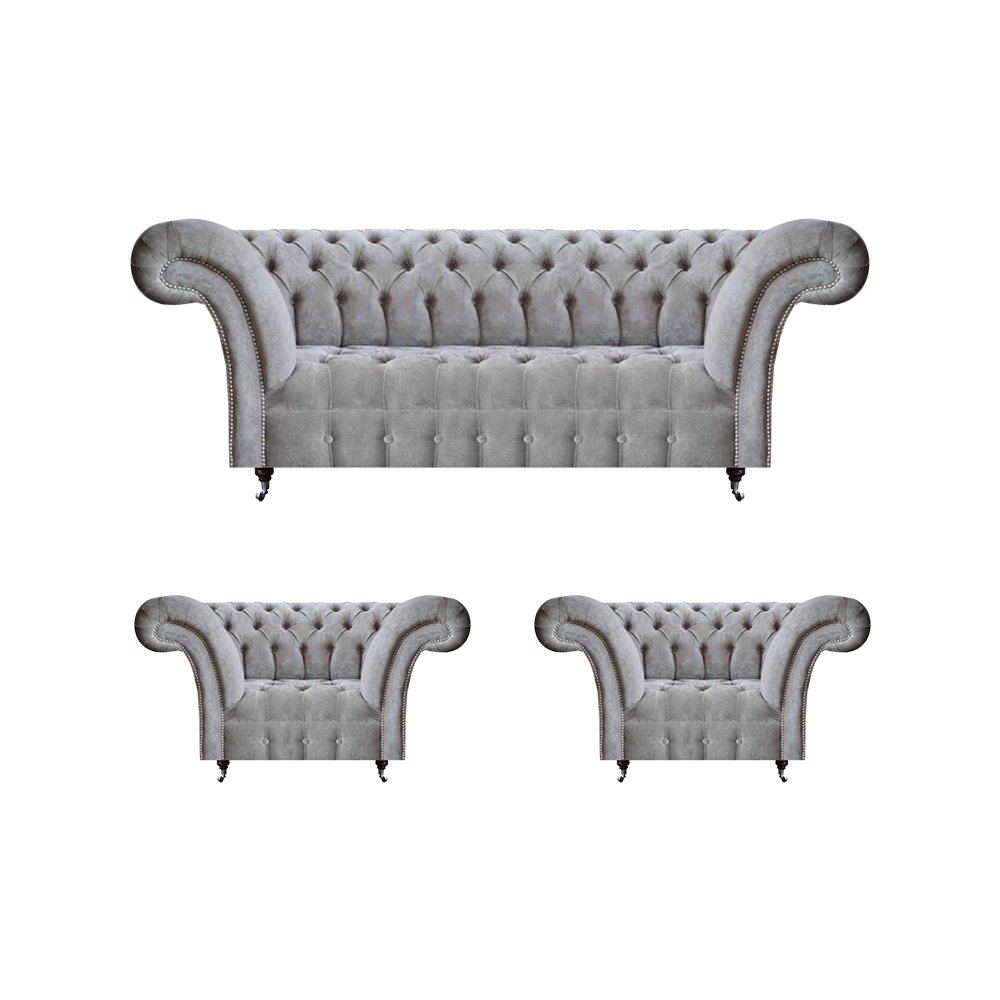 Diese elegante Sofagarnitur in Grau besteht aus einem großzügigen Dreisitzer Sofa und zwei bequemen Sesseln im klassischen Chesterfield-Stil.