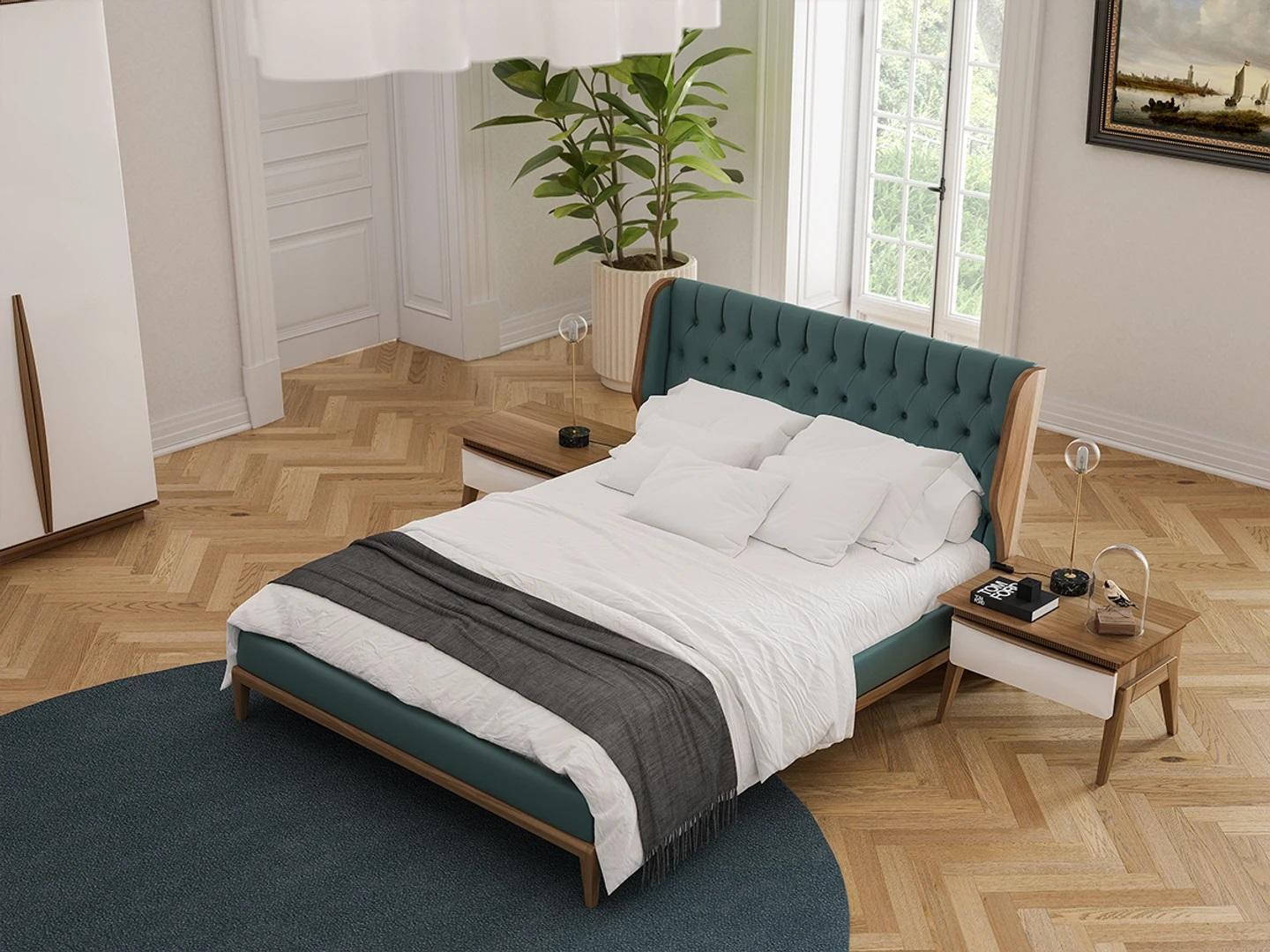 Erneuern Sie Ihr Schlafzimmer mit diesem modernen Komplettset von XL Moebel! Das Set enthält ein Bett mit einer Liegefläche von ca. 160 x 200 cm, 2 Nachttische, einen Kleiderschrank und eine Bank. Hergestellt aus hochwertigem Holz in den Maßen: Bett ca. 171 x 228 x 113 cm, Nachttische ca. 71 x 50 x 47 cm, Kleiderschrank ca. 268 x 70 x 225 cm und Bank ca. 159 x 47 x 37 cm. Bringen Sie mit diesem stilvollen Schlafzimmer-Ensemble Frische in Ihr Zuhause!