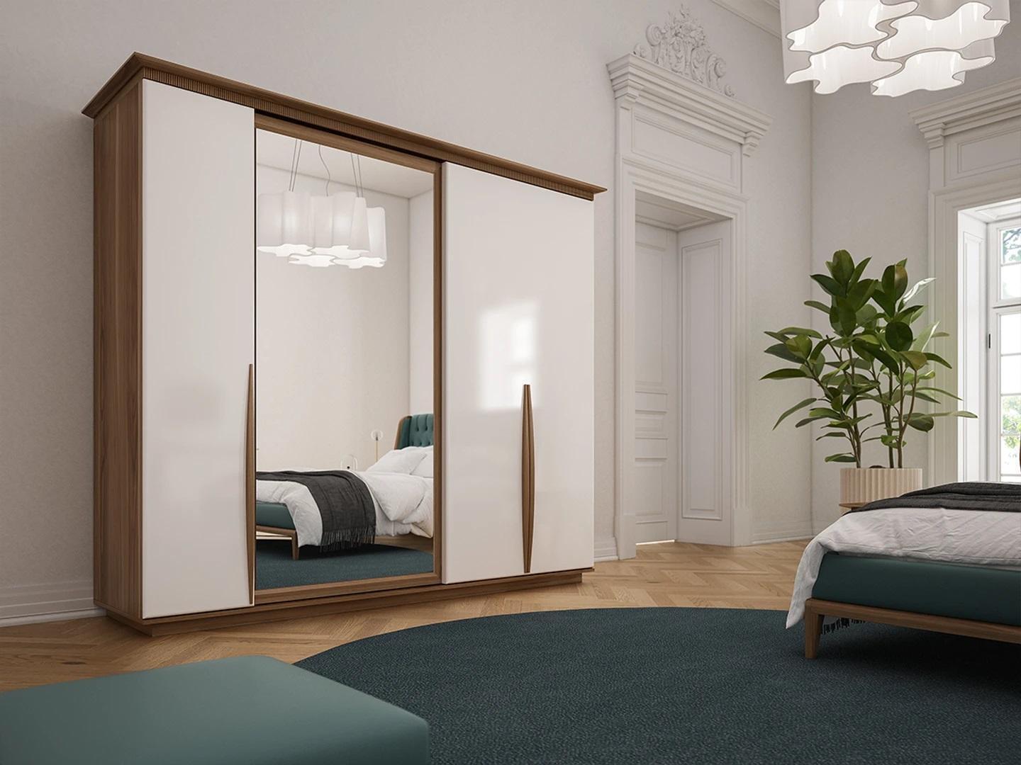 Schlafzimmer, Bett, Nachttisch, Bank, Kleiderschrank