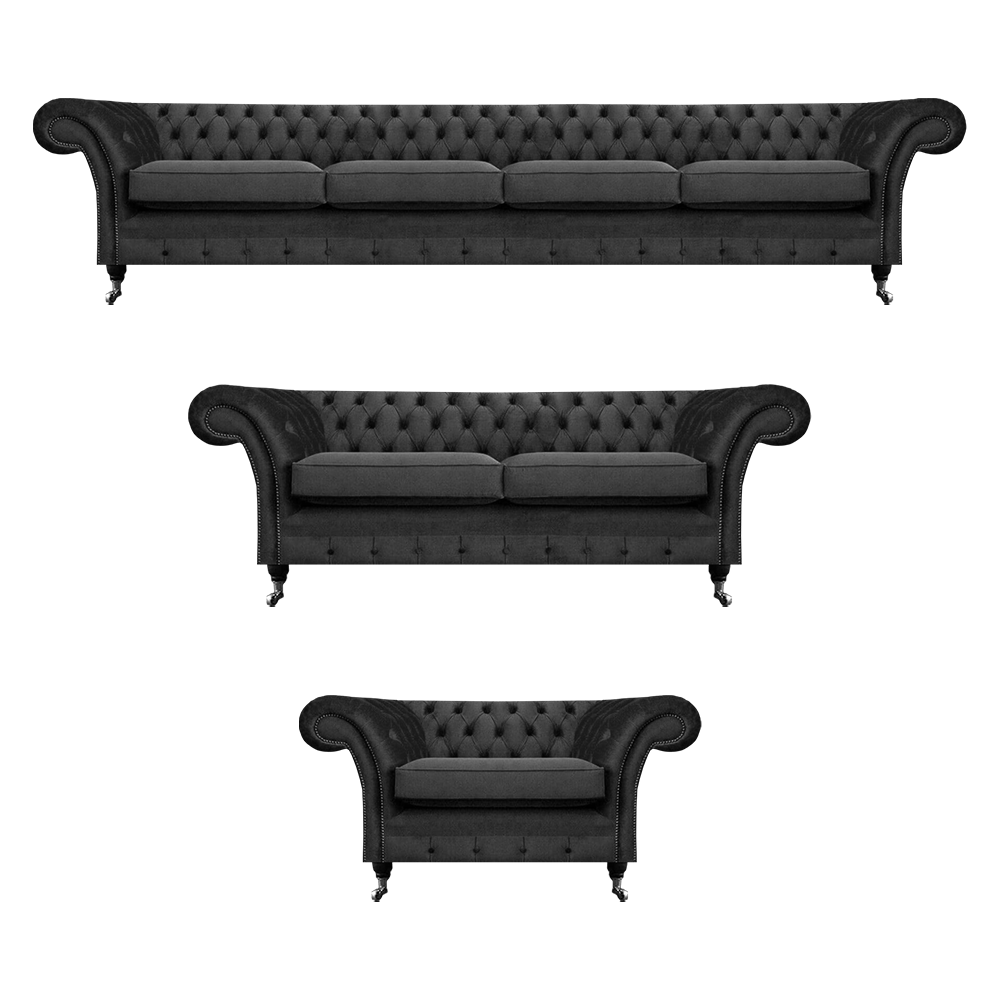 Entdecken Sie unser Komplett Set Chesterfield Sofas - die perfekte Einrichtung für Ihr Wohnzimmer! Dieses hochwertige Sofagarnitur umfasst ein 4-Sitzer Sofa, ein 2-Sitzer Sofa und einen bequemen Sessel, alle mit den Maßen von ca. 275 x 90 x 80 cm, 180 x 90 x 80 cm und 130 x 90 x 80 cm. Mit der Option, einen weiteren 1-Sitzer dazu zu bestellen, können Sie Ihr Wohnzimmer ganz nach Ihren Wünschen gestalten. Wählen Sie aus einer Vielzahl von Farben wie Braun, Grün, Schwarz, Blau, Rot oder Grau und entscheiden Sie sich für Premium Kunstleder, Echtleder, Samtstoff oder den fleckenabweisenden Magic Home Stoff. Bei der Materialwahl haben Sie die Möglichkeit, Ihr Sofa individuell anzupassen. Mit Optionen wie Bettfunktion mit Matratze oder der Veredelung mit Kristallsteinen wird dieses Set zu einem luxuriösen Blickfang in Ihrem Zuhause. Das Innengestell aus echtem Holz und der Federkern sorgen für Stabilität und Komfort. Gestalten Sie jetzt Ihre Traumgarnitur und machen Sie Ihr Wohnzimmer zu einem stilvollen Ort der Entspannung!