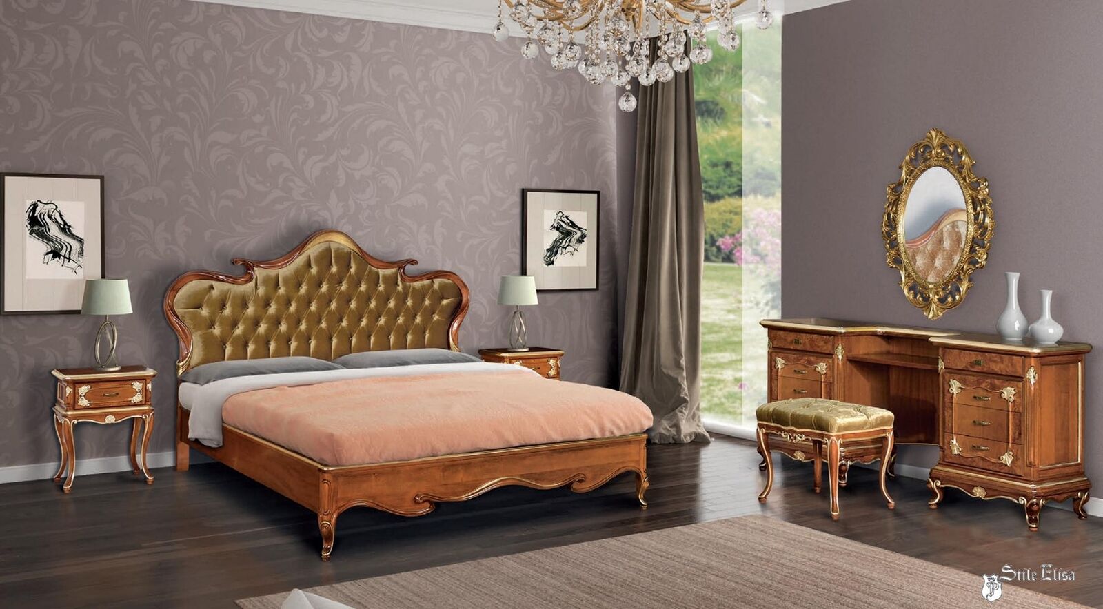 Entdecken Sie das 5-teilige Set von Hersteller aus Italien Stile Elisa, bestehend aus Schlafzimmer Bett, zwei Nachttischen, Schminktisch und Hocker - alles, was Sie für Ihr Schlafzimmer benötigen. Das Doppelbett bietet eine großzügige Liegefläche von ca. 180 x 200 cm und wird von hochwertigem Holz in den Maßen ca. 208 x 213 x 150 cm gefertigt. Die beiden Nachttische mit den Maßen ca. 52 x 35 x 66 cm bieten praktischen Stauraum, während der Schminktisch mit einer Größe von ca. 170 x 43 x 80 cm und der Hocker mit ca. 60 x 55 x 53 cm für zusätzliche Eleganz und Komfort sorgen. In klassischem Design und der Farbe wie abgebildet, verleiht dieses Set Ihrem Schlafzimmer einen Hauch von Italienischem Flair. Gönnen Sie sich dieses handgefertigte Möbelstück und tauchen Sie ein in luxuriösen Schlafkomfort!
